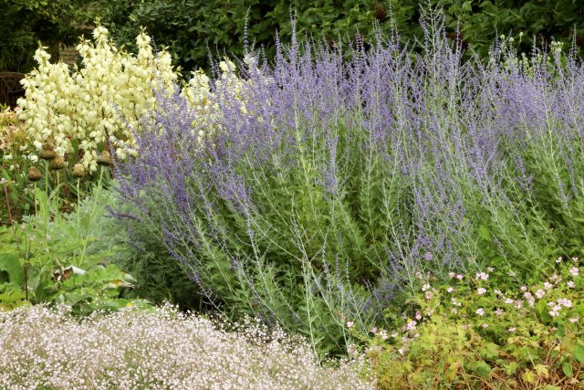 Котовник Фассена формирует воздушные волны из голубовато-лиловых соцветий. Он долго цветёт, легко переносит засуху и жару, быстро восстанавливается после обрезки и красиво смотрится большими массивами.