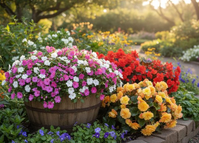 Бальзамин – классика для тенистых мест, где большинство однолетников отказывается цвести. Бальзамин «Бикон Чикаго Миксче» (Impatiens ‘Beacon Chicago Mixture’) – это смесь ярких оттенков, которая создаёт плотную, равномерную куртину даже в глубокой тени. Растения цветут обильно, формируя сплошной цветовой ковёр.