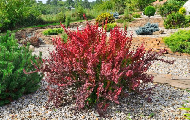Не отстают и барбарисы. Самый эффектный вид — барбарис Тунберга (Berberis thunbergii). Есть целая серия сортов с листвой, меняющей цвет: