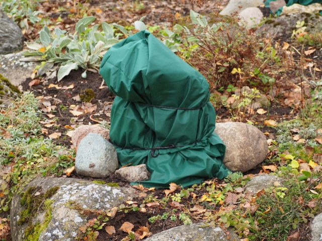 Такие растения после мульчирования сухими сыпучими материалами ещё в середине сентября желательно накрыть овощными ящиками, и сверху положить куски плёнки или тентового материала. После начала заморозков укрыть толстым нетканым материалом.