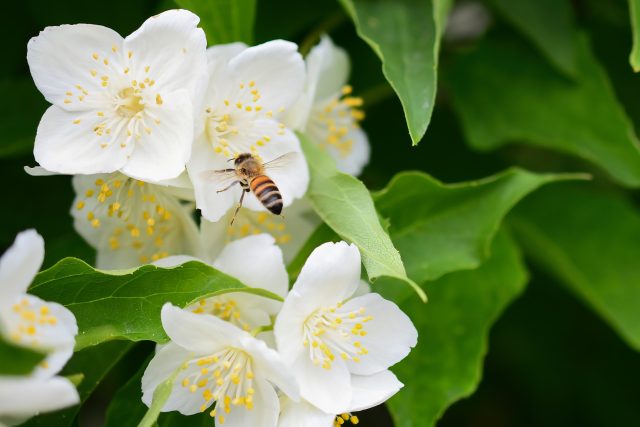 «Бялы Каржел» (Philadelphus ‘Bialy Karzel’), «Силвер Шоуэрс» (Philadelphus ‘Silver Showers’) — малыши метрового роста с простыми ароматными цветками.