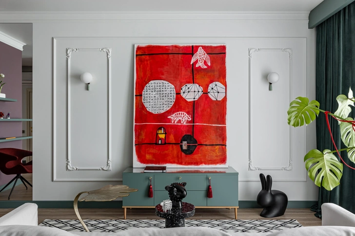 Гостиная. Краска, Eskaro. Лепнина, «Европласт». Инженерная доска, TarWood. Комод выполнен на заказ. Бра, Odeon Light. Пуф-заяц, Qeeboo. Картина Светы Баевой.