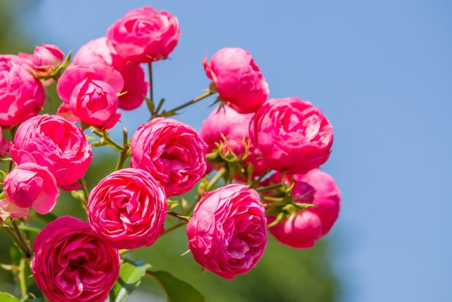 Эта роза считается одной из самых популярных в мире, и не зря. Хайдетраум цветет практически без перерыва с начала лета до первых заморозков. Ее цветки ярко-розовые, махровые, собраны в кисти. Куст формирует плотную подушковидную форму высотой около 60-80 см, не разваливается и хорошо держит заданную структуру.