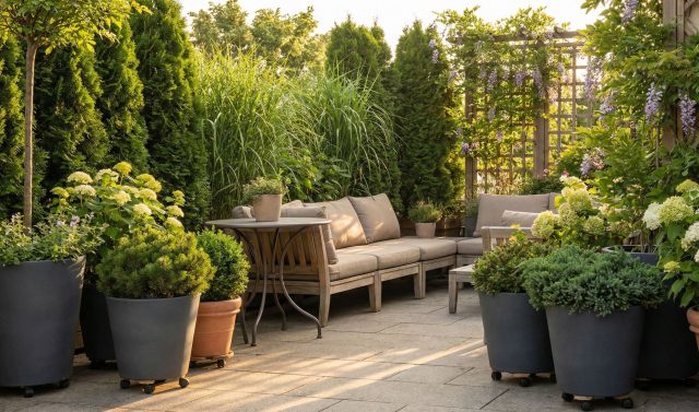 Мобильный сад в контейнерах позволяет гибко управлять пространством террасы. Используя кашпо на колесиках с туями или гортензиями, вы можете менять границы зоны отдыха, создавая живой заслон именно там, где он нужен сейчас.