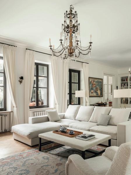 Гостиная. Диван, BoConcept. Кресла, винтаж, Италия, 1960-е. Настольные лампы, винтаж. Люстра, Генуя, XIX век, Мастерская Кати Гердт. Журнальный стол по эскизам хозяйки, мастерская Cucumbers. Шторы, Antoine d’Albiousse Editions.Гостиная. Кресла, винтаж, Италия, 1960-е. Винтажный комод, Бельгия, 1960-е. Картины из личной коллекции хозяев.