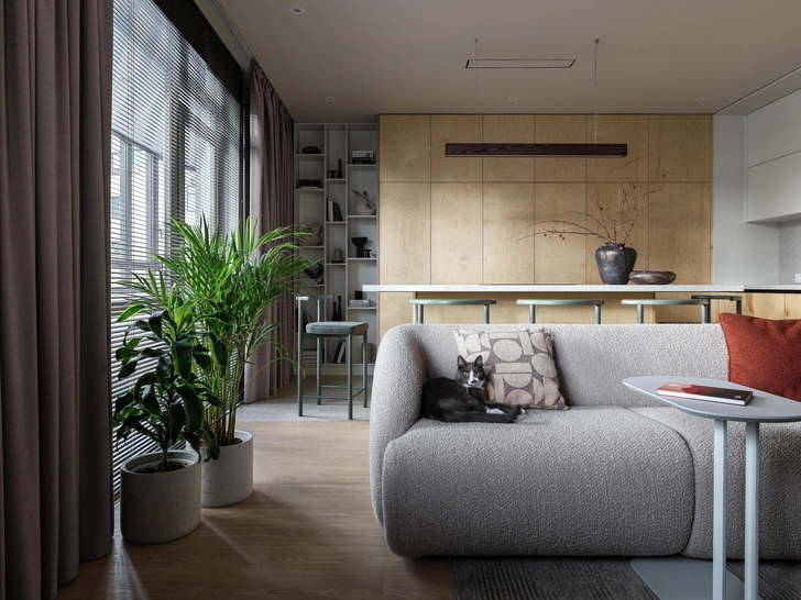 «Мы оставили открытой монолитную стену из бетона — она является частью интерьера гостиной, коридора и спальни. Также необычным элементом дизайна выступает кирпичная стена в спальне, она окрашена в цвет стен и потолка. Объединяющим материалом для всех помещений является березовая фанера — такое решение навеяно работами финского архитектора Алвара Аалто».