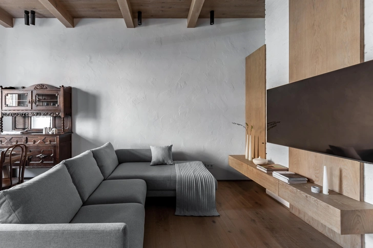 Почти вся мебель была изготовлена на заказ на семейном предприятии SilverHome. Особое внимание привлекает кухня с деревянными фасадами, украшенными лаконичной фрезеровкой. Ее дополняет бетонный барный стол с фактурными ножками, на которых оставили отпечаток гофрокартона.