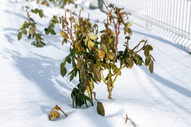 Розы часто гибнут не зимой, а от того, что их вовремя не раскрыли весной. Если снять укрытие слишком рано – они вымерзнут, поздно – растения начнут подпревать, а затем и подгнивать. Раскрывают цветы постепенно. Полностью это делают, когда сойдёт снег, почва оттает, температура поднимется выше нуля и минует угроза сильных холодов и возвратных заморозков. За зиму кусты отвыкают от солнца, поэтому для проведения работ лучше выбрать пасмурный день.