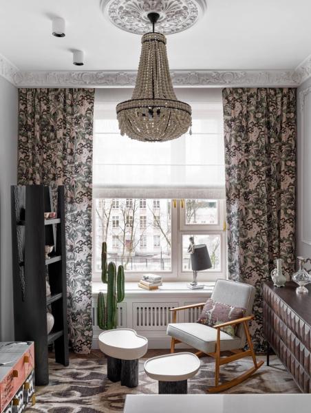 Люстра, Clay Moon. Кресло, L’Appartement. Столики, дизайн Евгении Шиловой, BeHome Buro. Ковер, «Декораторское ателье Марка Патлиса». Шторы, Décor Delights. Стеллаж, дизайн Марины Бейзель, BeHome Buro.