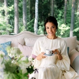 «Зелень букета и плетеные сервировочные салфетки символизируют весну и подчеркивают белизну фарфора российского бренда RES Objects. Нестандартная мятая форма тарелок (правда, они напоминают скорлупу?) и экстравагантные бело-золотые ручки на чашках делают композицию очень свежей и современной».
