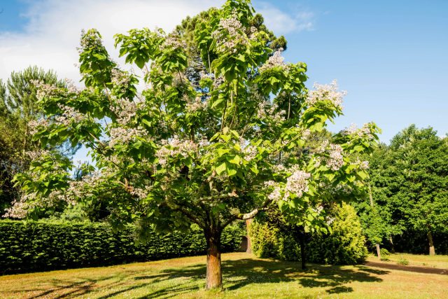 Идеальным местом станет участок, который получает достаточно солнечного света или находится в легкой полутени. Хотя катальпа выносит тень, при полном солнечном освещении она демонстрирует более пышное цветение и густую листву.