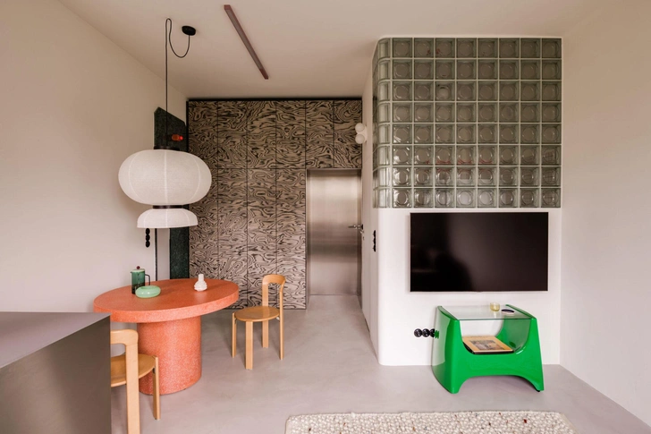 Между двумя блоками стоит круглый стол из розового терраццо с винтажными стульями, разработанными швейцарским дизайнером Бруно Реем (Bruno Rey), — оммаж эстетике группы Memphis. Стальная дверь в шкафу ведет в спальню с огромным фиолетовым шкафом и изголовьем кровати из мрамора с красивыми серыми прожилками, который обладает почти таким же психоделическим эффектом, как узорчатый шпон дерева.