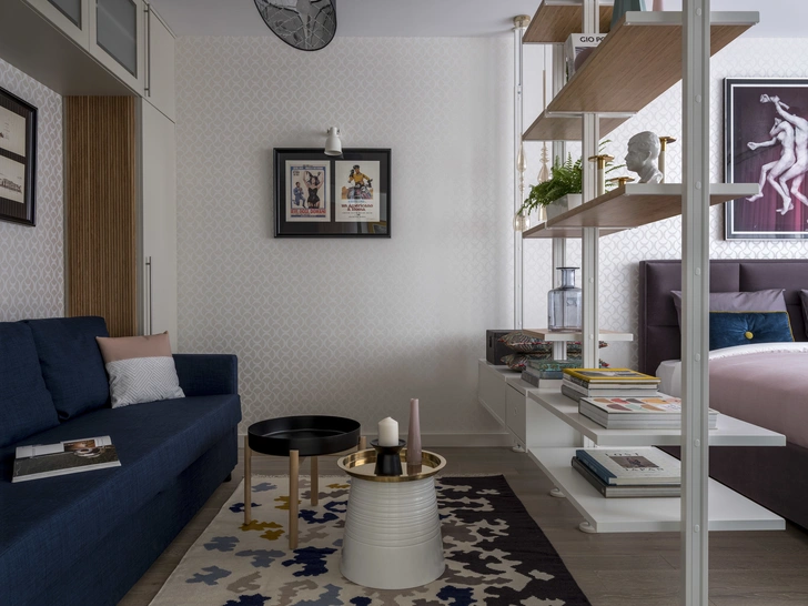 «Гостиную разделили на две функциональные части с помощью перегородки-стеллажа. Ближе ко входу оформили лаунж-зону с удобным диваном, вписанным в нишу с ящиками. Ближе к окну — зону спальни с большой кроватью и гардеробным шкафом. Разделение поддержано и световым решением: в гостиной висит объемная люстра, а в спальне — потолочные светильники. Над кроватью разместили картину Татьяны Бродач, которая идеально вписалась в интерьер, хотя и показалась хозяевам чересчур откровенной сначала».