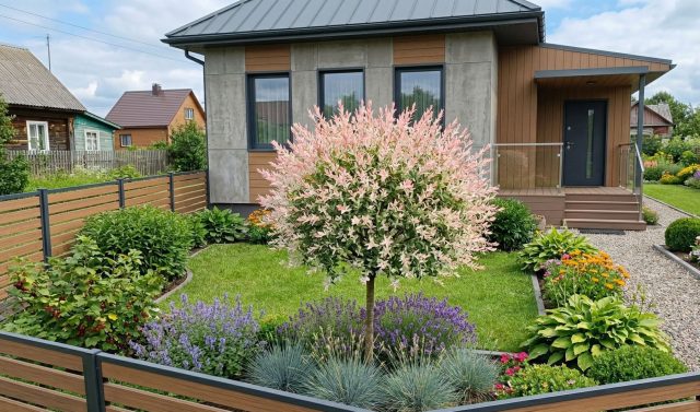 Важный момент: ива даёт сильный контраст, поэтому рядом с ней нужен спокойный фон. Если посадить её в миксбордер с пёстрыми хостами и цветными барбарисами, получится визуальная каша.