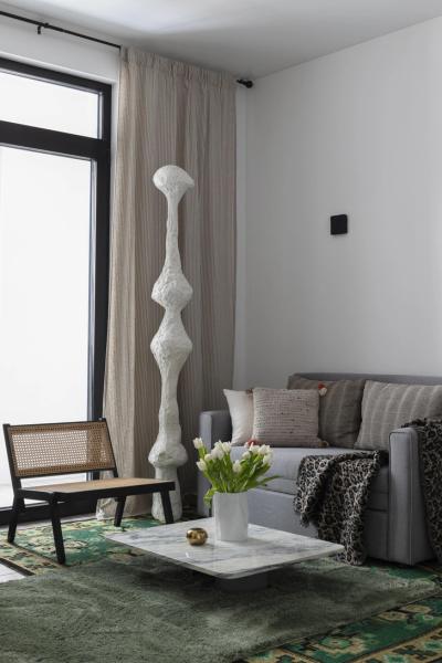 Гостиная получилась довольно просторной. И здесь есть дополнительное спальное место — раскладной диван. Рядом с ним расположилось кресло с плетеными вставками и низкий столик, выполненный из натурального камня, а на полу лежит ковер 1950-х годов, принадлежавший моей бабушке.
