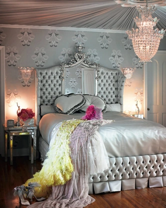 На входе в квартиру Пэрис Хилтон (Paris Hilton) красуется надпись: «Принцесса Пэрис», и интерьер полностью соответствует королевскому статусу его владелицы. Спальня Пэрис выполнена в гламурном стиле: модная черно-серебряная гамма, огромная кровать с балдахином, зеркала… Блистательно, как и сама хозяйка!