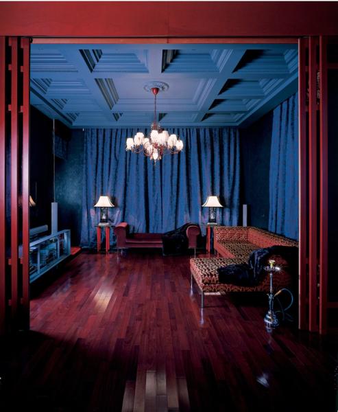 Погружение в атмосферу будуара происходит буквально с порога: пол из черной плитки загадочно поблескивает и мерцает, а красное пухлое кресло «Наполеон I» пылко приветствует входящих. Дальше — больше. Черный потолок, темно-вишневый пол, люстры с подвесками, шкуры на пестрых диванах — все формы вычурные, цвета насыщенные. Кажется, еще чуть чуть, и интерьер превратится в декорации к фильму о развлечениях при дворе какого-нибудь французского монарха. Но Диане удалось, балансируя на грани между вкусом и безвкусицей, сохранить равновесие.