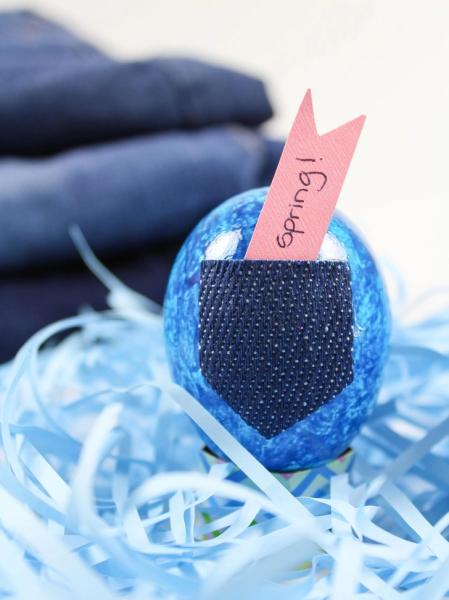 Модники в семье оценят необычную окраску яиц, напоминающую джинсы. Для большего эффекта на скорлупу можно прикрепить небольшой кармашек из джинсовой ткани. И положить туда забавную записку или пожелание.