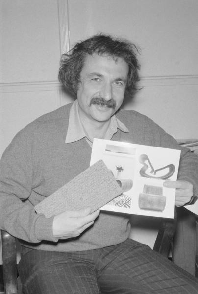 Фрэнк Гери с образцом картона и эскизом кресла, 1972.