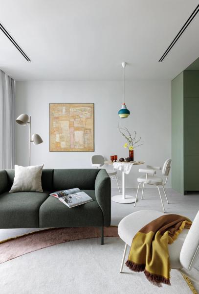 Кухня не имеет отдельного помещения и выделена с помощью оливкового оттенка, в который окрашены не только мебельные фасады, но и потолок. Это визуально расширяет пространство, уводя зону готовки в глубину. Такой же цвет продолжается и на одной из стен гостиной.